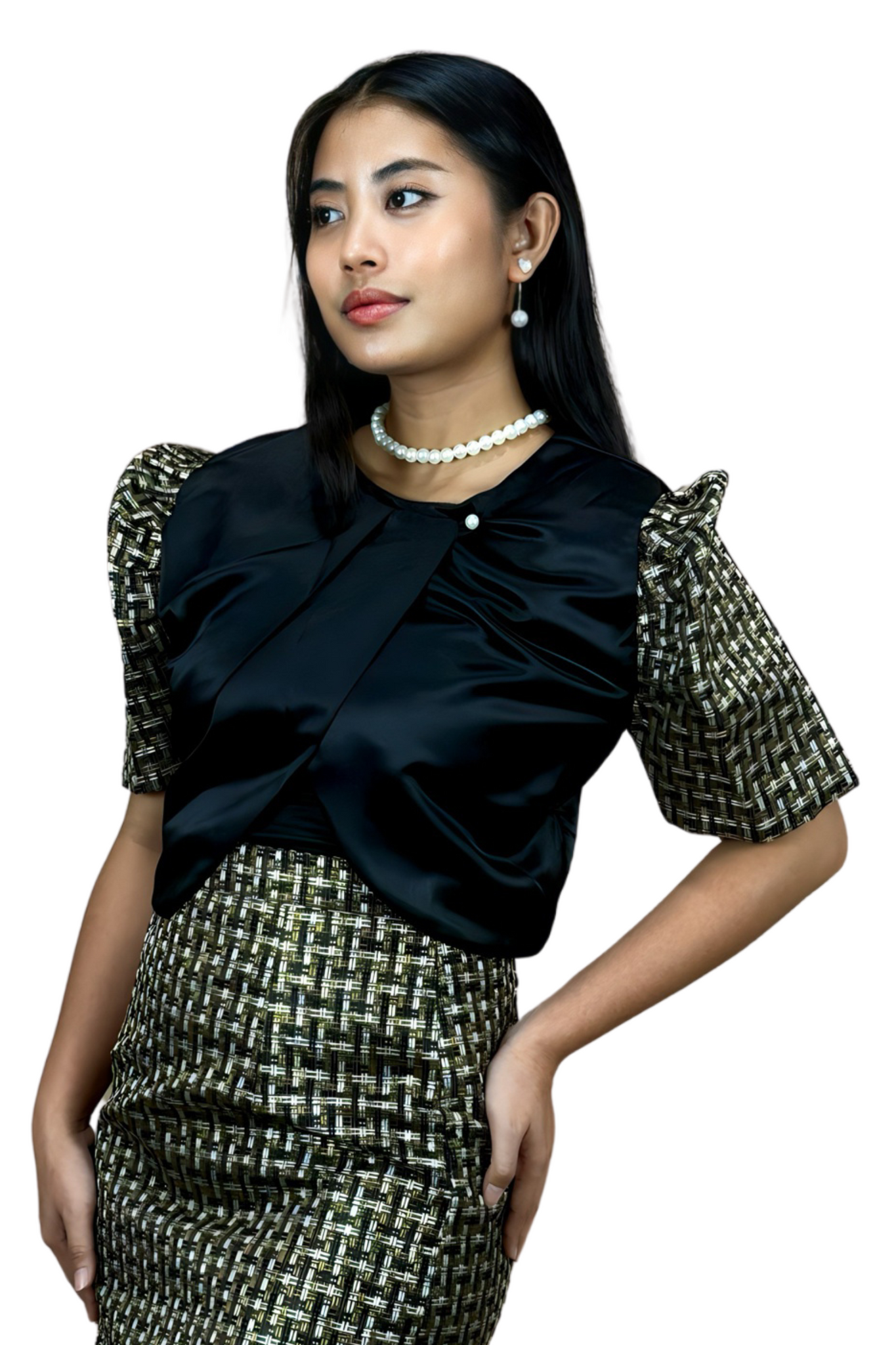 Make a bold cultural statement with this stunning two-piece skirt set crafted from authentic ethnic fabric. This elegant ensemble features a tailored pencil skirt and a uniquely structured top with a navy satin finish. This weave traditionally handwoven adds a rich texture and a meaningful nod to Filipino heritage, beautifully blending tradition with modern sophistication.