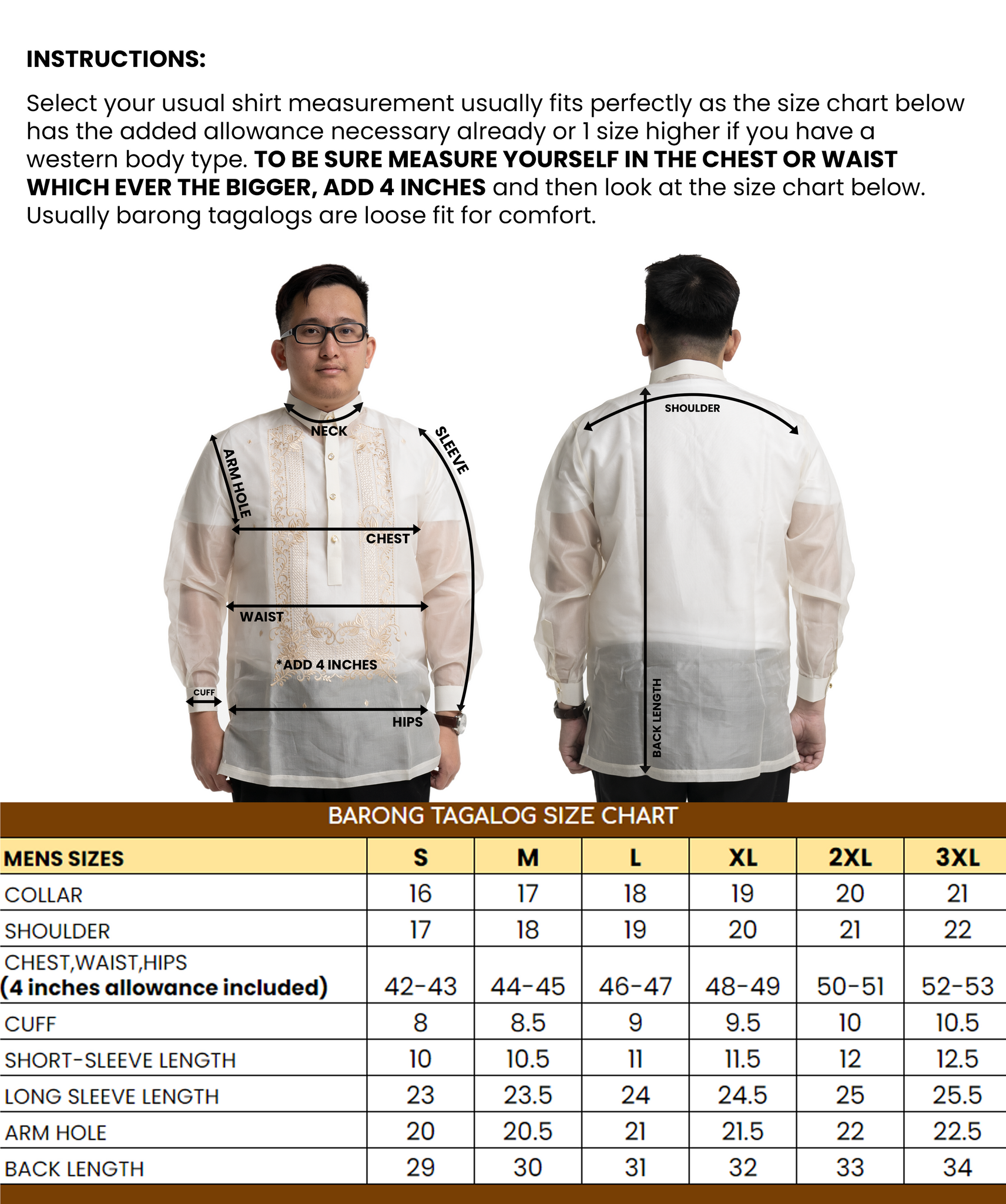 BarongWorld is a quality seller of Barong Tagalog, we want you to really get a good quality, 100% brand new and good experience with our products. This is why we HANDMADE with Love your products in detail to ensure that you are satisfied. We also have a 24/7 customer support. At BarongWorld our mission is to give you the Barong Tagalog that will last a lifetime.