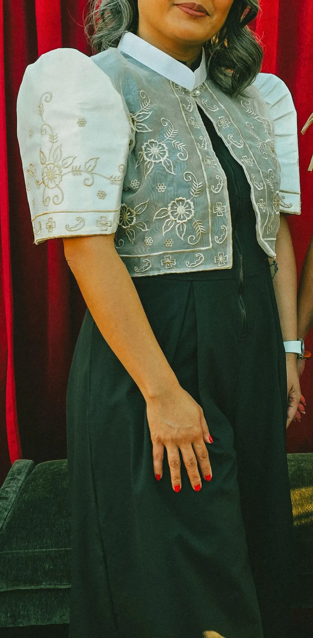 - Knee-length modern Filipiniana silhouette