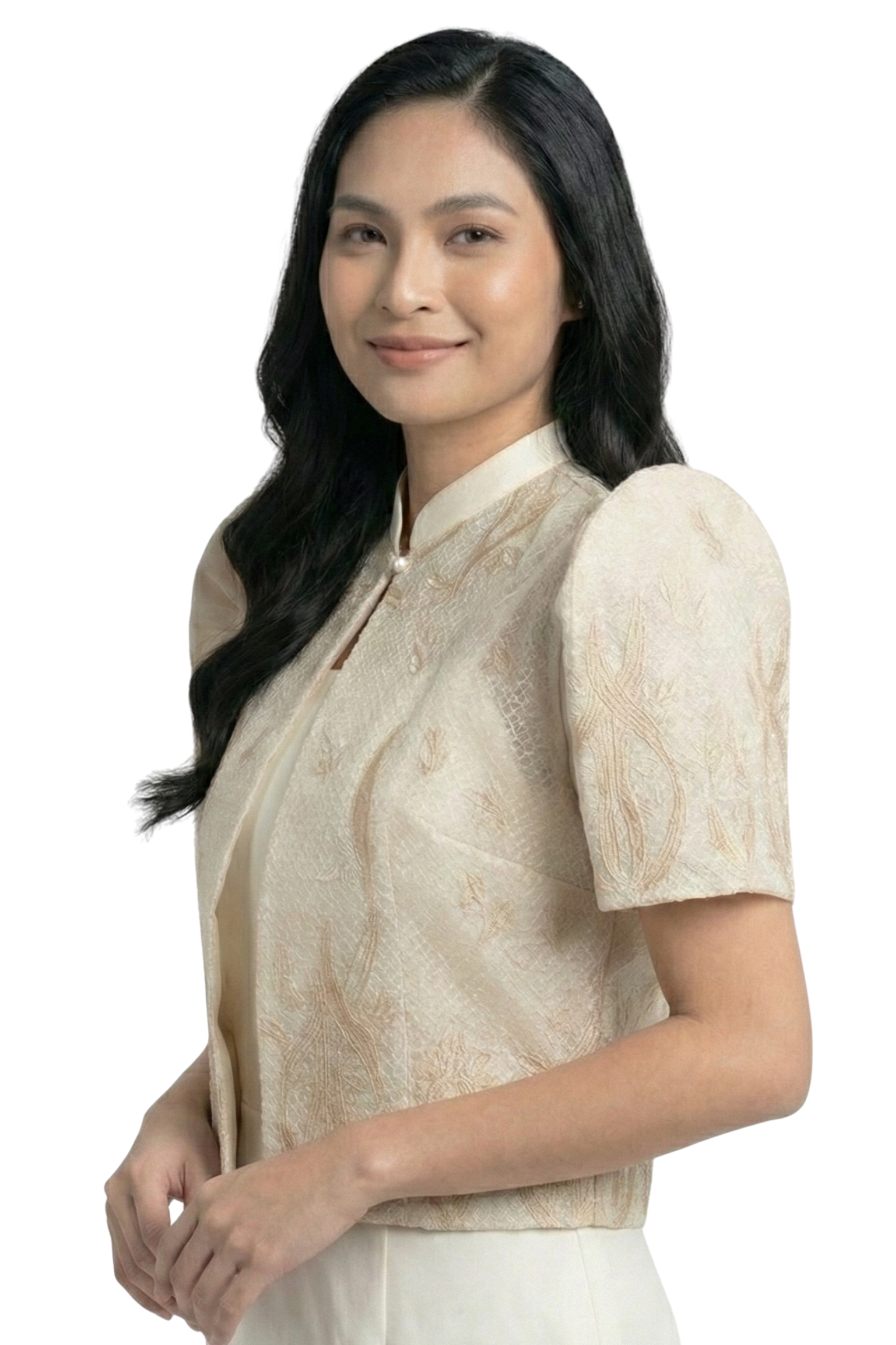 Enhance your cultural and formal clothing with our Elegant Filipiniana Bolero. It is a refined blend of heritage and modern design. It features Philippine butterfly sleeves and a delicate butterfly sleeve. This bolero is ideal for adding structure and sophistication. Its soft ivory color adds versatility, and it is ideal for weddings and cultural celebrations.