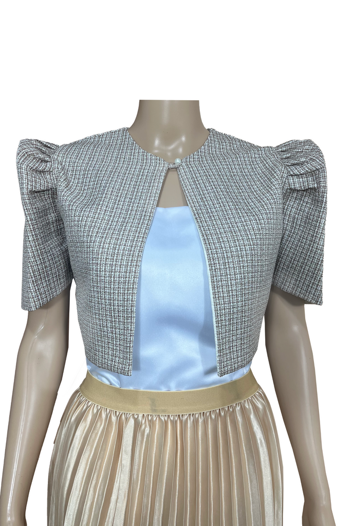 Step into timeless elegance with this Modern Filipiniana Bolero. Featuring signature butterfly sleeves and a round neckline accented with a pearl button closure, this piece effortlessly blends classic tradition with modern flair. The structured woven fabric adds a refined texture, making it the perfect layering piece over formal or semi-formal wear.