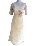 The chiffon Filipiniana gown in beige includes a fully laced bodice with delicate half sleeves and a skirt made of chiffon with cascading layers. Its charm is enhanced with a delicate waist flower accent which makes this gown suitable for weddings and evenings, and bay celebrations. While browsing, check out our vast collection of Barong Tagalog and Kids Barong for the entire family.