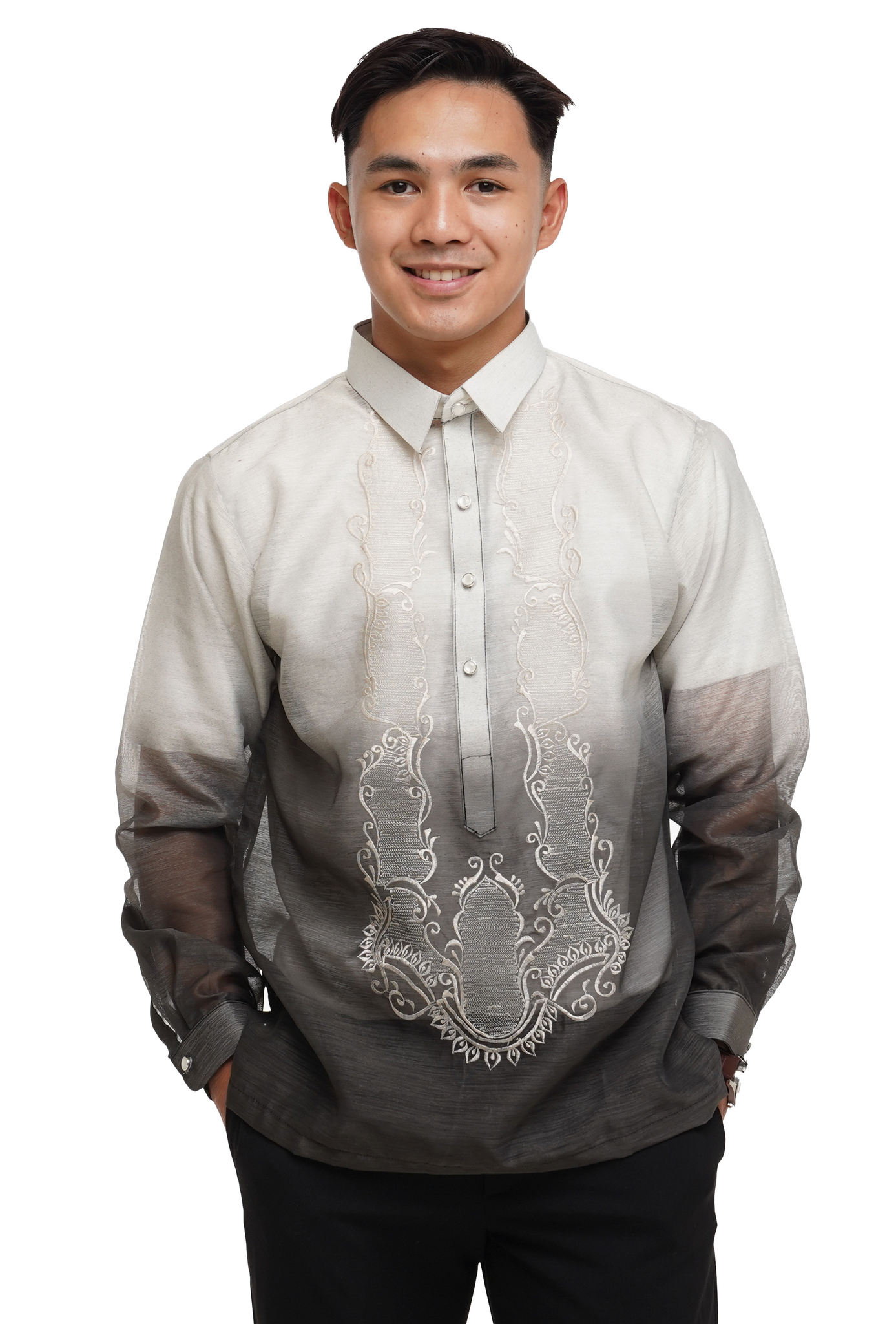 Look unique wearing this gradient Jusilyn Barong Tagalog for men, warm beige deep charcoal with white embroidery accents. Embroidered with white thread, this Barong is a modern take on a classic design, perfect for weddings, formal occasions, and cultural celebrations. Visit our website for an extensive selection of Filipiniana Dress and Kids Barong.