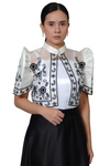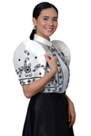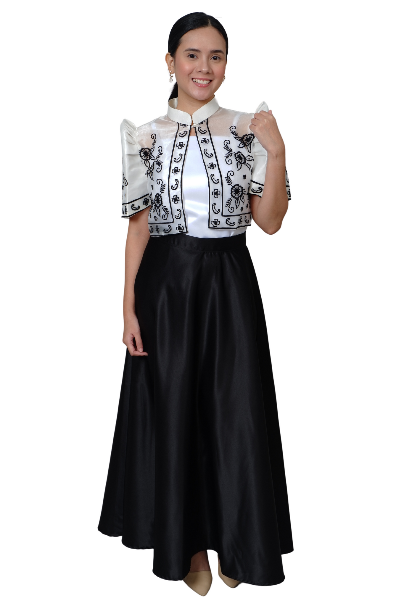 Embrace the everlasting beauty of this Filipiniana Set which includes an exquisitely embroidered Bolero made from organza and a flowing skirt made from duchess satin. This outfit is ideal for wedding, cultural and formal events. This outfit is made to order and highlights the masterful Filipino artistry from the intricate embroideries to each stitch. It is a piece that you can wear for many generations that embodies class and Filipino culture. For more of our collections, visit our website for Barong Tagalog and Kids Barong.