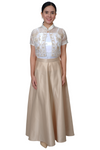 This Filipiniana set comes with a lovely embroidered organza bolero and a beautifully flowing satin duchess skirt which gives an impression of sophistication and grace. This is best suited for weddings or other special events as it is both traditional and classy. This dress is made for longevity and comfort. Feel free to browse our entire collection of Barong Tagalog and Kids Barong on our website.