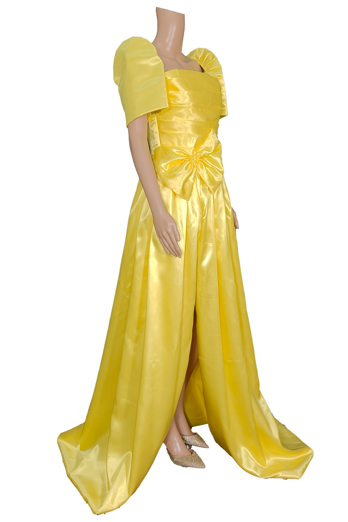 Step into elegance with this stunning Filipiniana-inspired gown, crafted from luxurious duchess fabric. The gown features iconic emelda sleeves, adding a touch of traditional sophistication, while the contemporary side slit offers a modern twist, perfect for formal occasions or special events. A beautifully detailed bow accentuates the waist, creating a flattering silhouette. The smooth duchess finish and graceful flow of the skirt exude timeless elegance, making this gown an ideal choice for those looking to merge classic Filipino style with a bold, stylish edge.